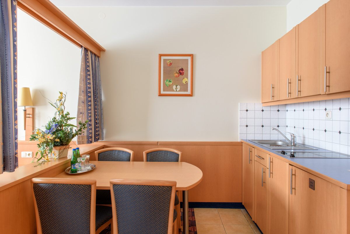 Apartament z dużym łózkiem, aneksem kuchennym i prywatną łazienką.
